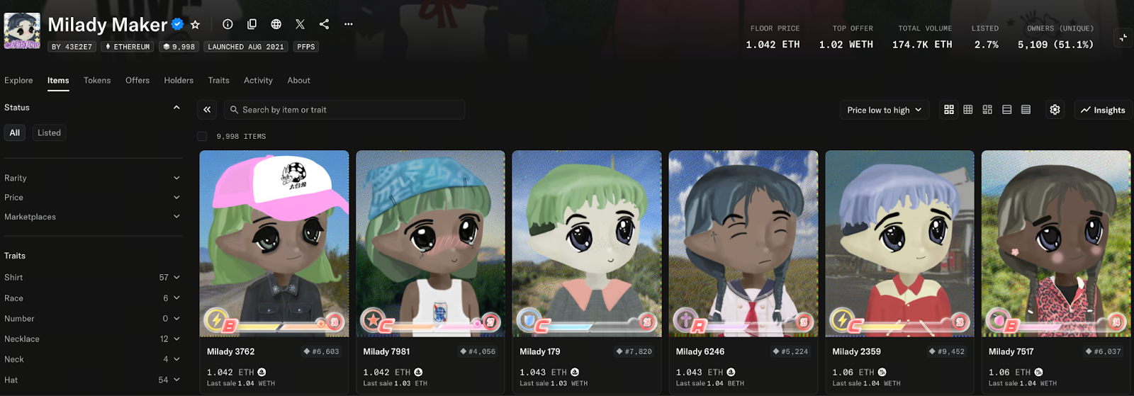 Es importante señalar que el precio mínimo de Milady Maker ha caído notablemente desde entonces. Actualmente, distintos proveedores de datos sitúan el precio mínimo en torno a 1,08 ETH (unos 3 370 US$).