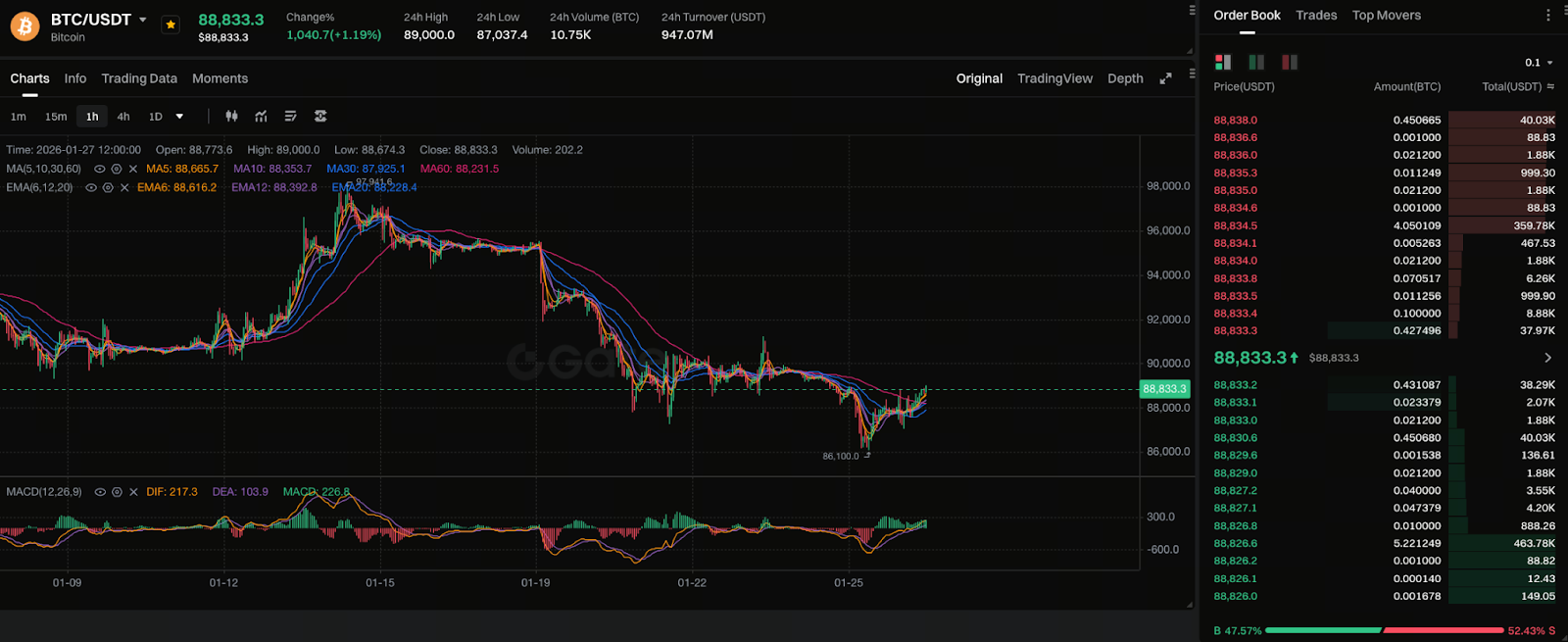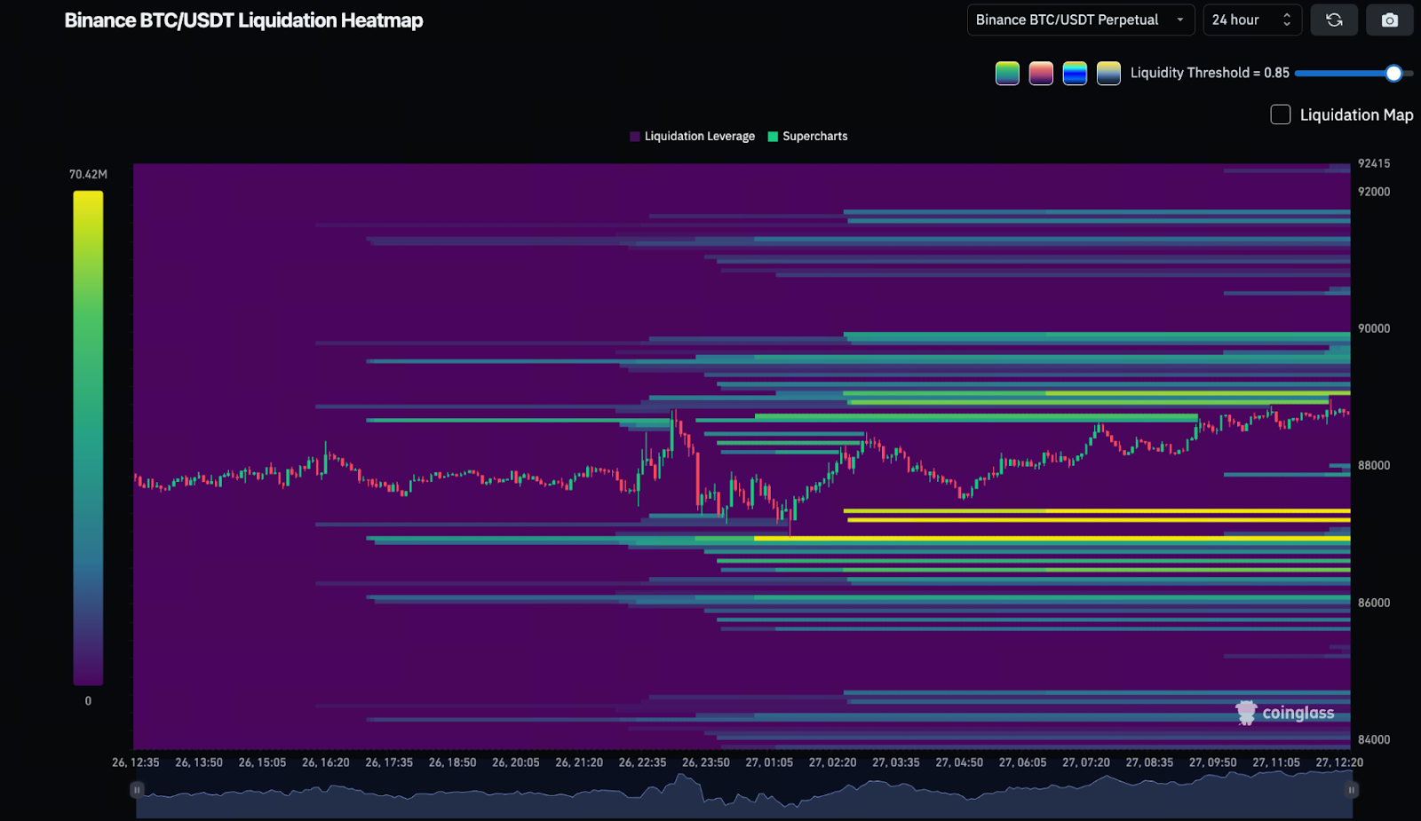 Đến ngày 27 tháng 1 năm 2026, Bitcoin đang được giao dịch ở mức khoảng 88.850 USD. BTC hiện tích lũy quanh vùng 88.700 USD, quay lại vùng giá cao hơn. Với thị trường biến động mạnh, giá thanh lý của các nhà giao dịch sử dụng đòn bẩy thường sát với giá giao ngay, nên việc xác định các ngưỡng quan trọng này rất cần thiết cho quản lý rủi ro.